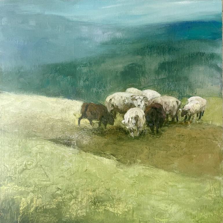 a small flock of sheep grazing in a mountain field, summer in the Green Mountains of Vermont