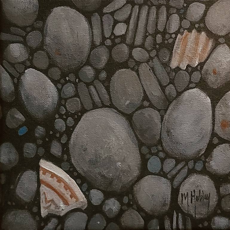 "Pebble Toescape 3 Study" presents a captivating arrangement of smooth beach stones, masterfully rendered in acrylic on canvas. The composition features an array of pebbles in diverse shapes and sizes, primarily in calming gray tones. This small but impactful still life painting draws the eye with ...