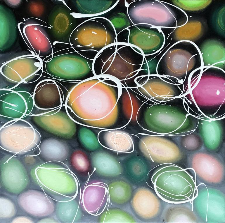 Original abstract oil painting of colourful pebbles in a shallow pool, highlighted by drips of pure white paint to suggest water ripples as the pebbles break the surface.