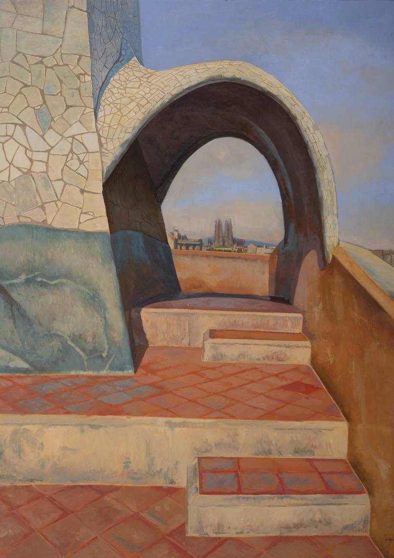 This work represents part of the terrace of the house La Pedrera, located in Barcelona, Spain. This architecture was made by the great Catalan architect Antoni Gaudi between 1906 and 1912. Shapes that suggest me the idea of painting it because the composition of the shapes contained in this place is...