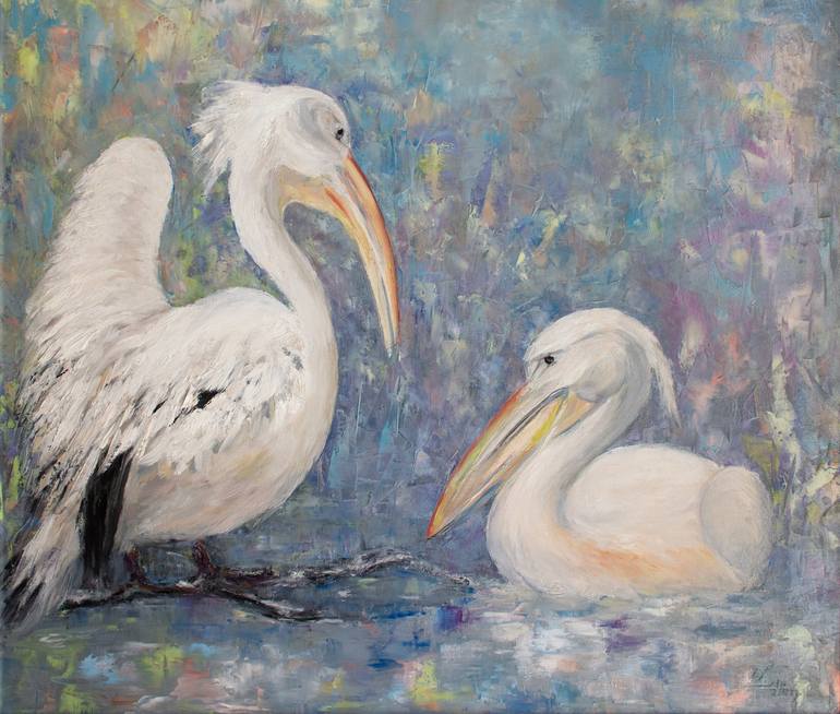 I was inspired to create this art work by visiting the ornithological park and communicating with these amazing pelican birds. Art work was painted with ease, with large impasto strokes, not only with a brush but also with a palette knife. The bright, impressionistic background was chosen by me d...