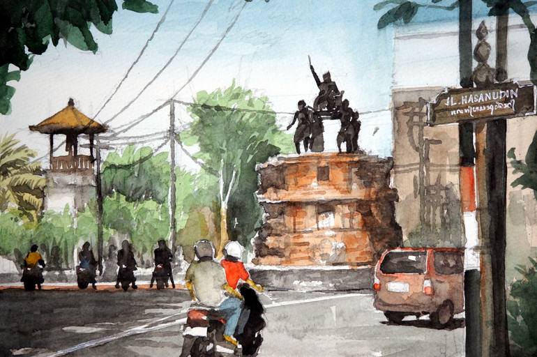 This statue was made for honoring the heroic whip-cracking raja Ida Cokorda Pemecutan IX, the grandfather of the present raja Cokorda Pemecutan XI, sits high on a brick pedestal in the middle of the busy intersection just to the south side of the palace.