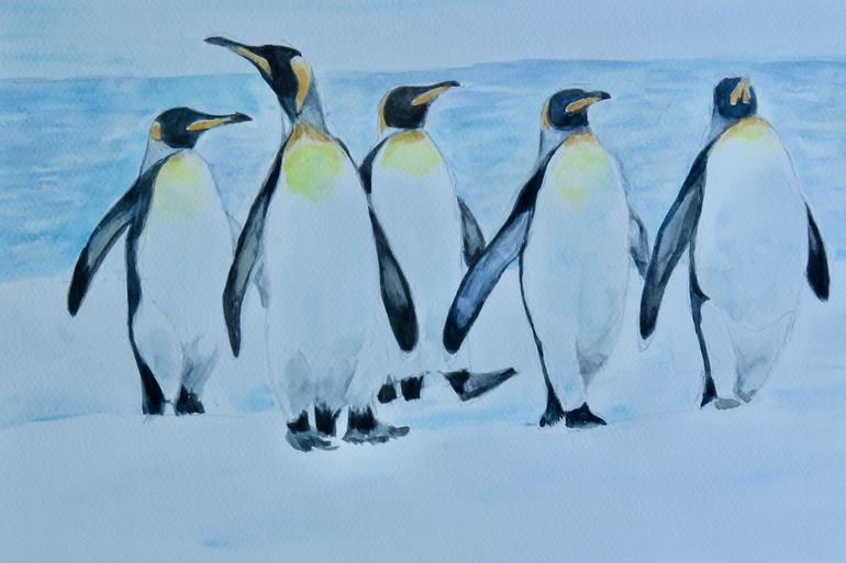 A group of 5 penguins walked towards me from the sea and waddled right past me in Falkland Islands. This inspired me to capture the cinematic quality of their movements through a series of paintings.
