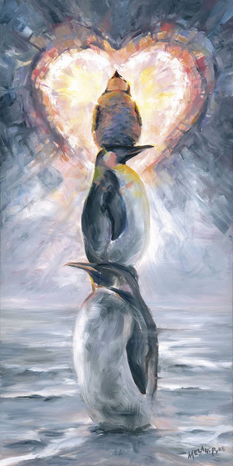 Penguins stacked up with a young one centred within a glowing heart: an image of love yet also raises questions about entitlement and coddling our youth. Oil on canvas 1.5 inch depth with edges painted as a continuation of the artwork, ready to hang (wire on back,) varnished, includes Certificate o...