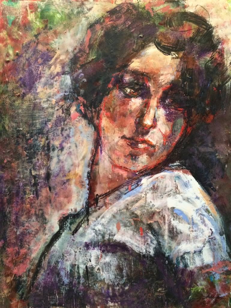 This encaustic painting is of a women, lost in thought. The are many layers of wax and resin paint of varying colors that I melted and scraped through with razor blades. The hot wax runs and drips to create even more texture. The surface glows like a ceramic tile that begs to be touched.