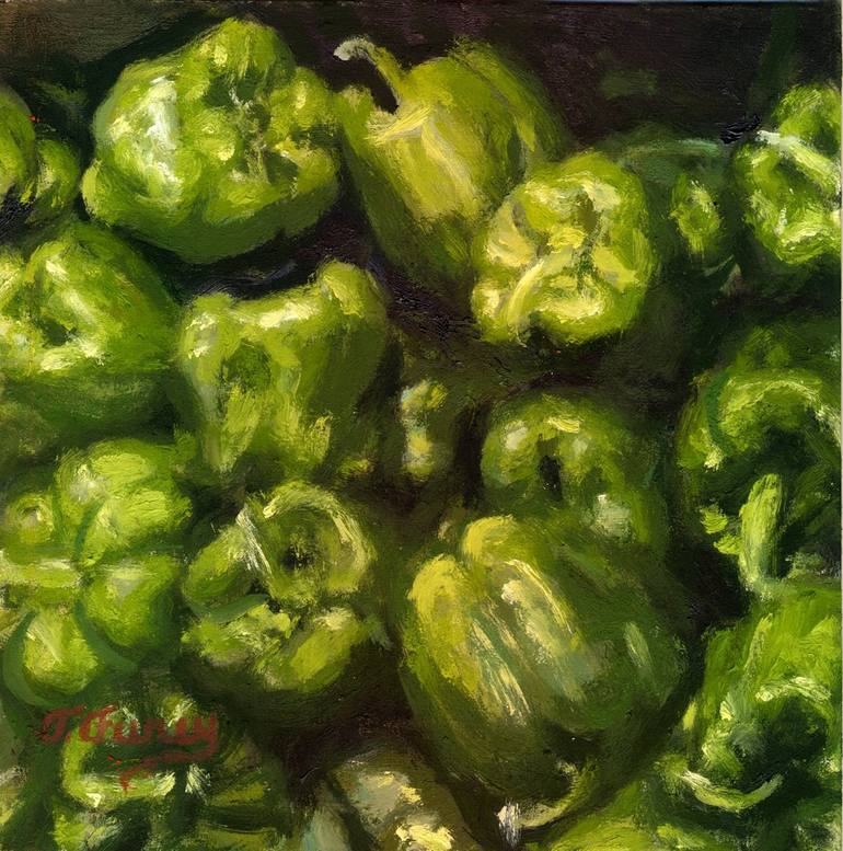 Title: "Pepper Gang", Alla Prima Oil Painting on Board, 8" x 8". Peppers, hanging out at the food store with my camera. Sounds creepy doesn't it! I liked the way the light bounced around the odd shapes of these peppers. It's more abstract to me than a picture of peppers.