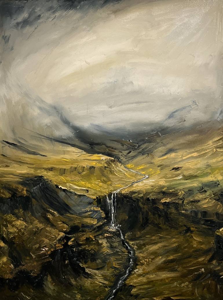 In this landscape, I use thick, sweeping strokes to channel the raw, untamed energy of nature. Capturing the vast expanse and dramatic contrast of the terrains under an ominous sky fills the picture with a tempestuous, yet serene emotion. The earthy tones and dynamic textures draw viewers into a wor...