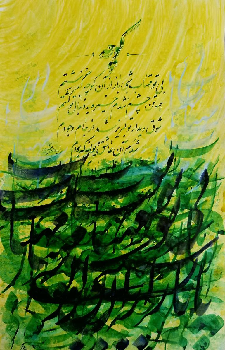 Persain Calligraphy poem by a Well Known Persian Poet named Fereydoon Moshiri. This is a multilayer, multicolor calligraphy in ink performed on white paper. No frame is included.