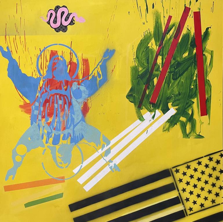 "Persephone at the Castle Gate," 2023, 66" x 66", acrylic, housepaint, spraypaint, gaffers tape, warning tape, and masking tape on canvas Sometimes one feels compelled to deploy imagery art connoisseurs find gauche. Or maybe one feels that way all the time.