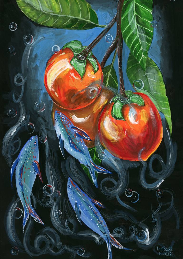 The artwork "Persimmon and Space Fish" is depicted with gouache paints on high-quality paper.
