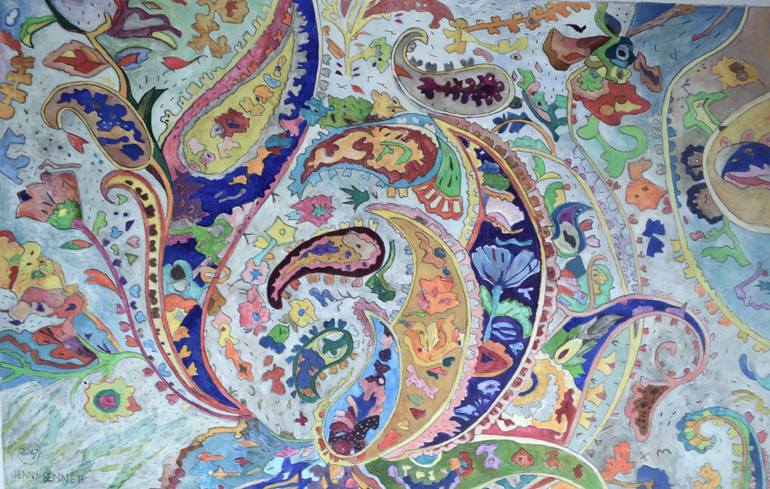 This series was inspired by recent works, paintings of flowers I grow, and the purchase of an old eiderdown, similar to the one I had as a child. I used to marvel at the intricacy of colour and line on the polished cotton fabric and I have learned a little of the long history of Paisley; the Scotti...