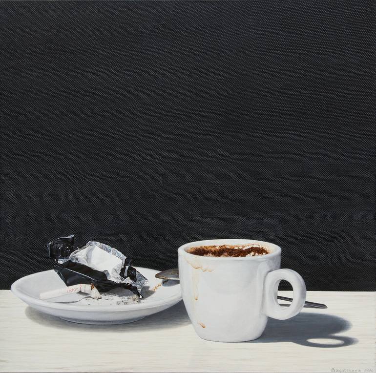 This is a painting from a series of hyperrealistic art works "Just Simple Things" about everyday things around us, which we often do not pay attention to, but which have firmly entered our lives. This picture captures the moment of a freshly drunk cup of coffee and a smoked cigarette. On a warm su...
