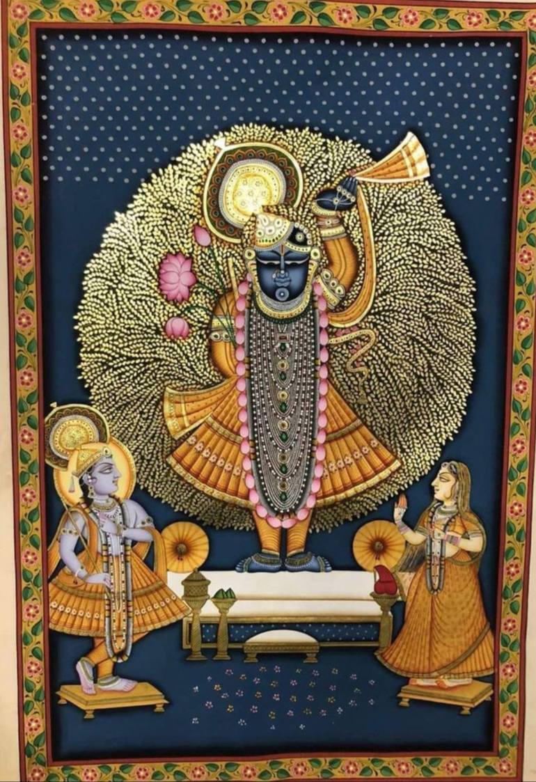 This is a Pichwai painting Made of Natural Stone Colors On Pure Cotton Cloth. HOME DECORATIVE PAINTING HAND PAINTED Pichwai is a traditional style of painting from Rajasthan. The word Pichwai stands for hanging at the back (Sanskrit word "Pichh" means back and "wais" means hanging). Pichhwai paintin...
