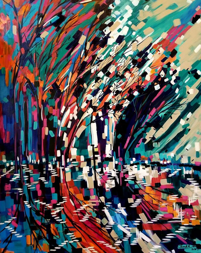 This painting is incredibly dynamic and full of movement in a very contemporary, stylized color palette and brushwork. There is a deliberate deconstruction of representation scenery of trees in a windy situation. The water is rippling in the wind. I want the audience to feel the vibrancy of the work...