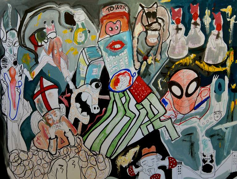 Painting made with acrylic, oil, markers and pencils on Fabriano paper. Work done in 2017. The Pig Tower work is a Bad Painting style piece with elements of pop and contemporary culture. The piece is inspired by the poetry book Poeta en Nueva York by Federico García Lorca.