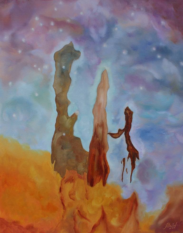 I was watching a YouTube video with space beauties and at the end of the clip my breath just stopped, seeing shots of the Pillars of Creation. At that moment I knew I was going to draw them and I couldn't wait :) I screenshot my favorite shot, then I took out my brushes, paints, canvas... and here i...