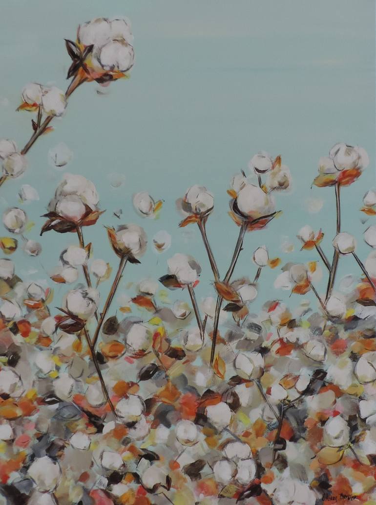 One of a series of my original works inspired by the beautiful cotton fields that are characteristic of Autumn in the South. This work is on 1 and 1/2 inch gallery wrapped canvas with the sides painted in the same background blue. Finished with a gloss protective coating, this painting will arrive ...