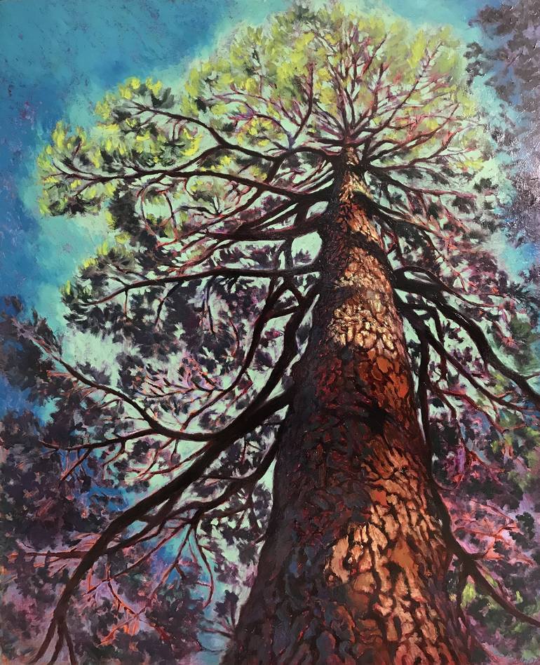 This pine tree grows at Memphis Botanic garden. It massive and trimmed so branches remind me ohands that wants to rich you and hold you tangled up. I absolutely love it. Painting is finished with black wooden trim on edges and ready to hang.