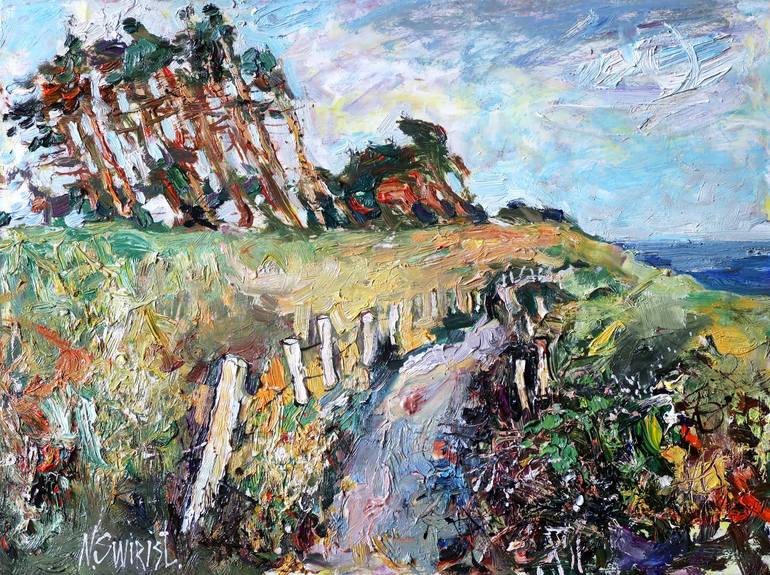 France. Brittany. The coast of the Bay of Biscay. The pines on the coast of the Bay of Biscay are strongly inclined under the influence of the monsoon. This gives the landscape a unique dynamics. The paths that pass along the coast compete in their picturesqueness with the ocean, the sky and the tre...