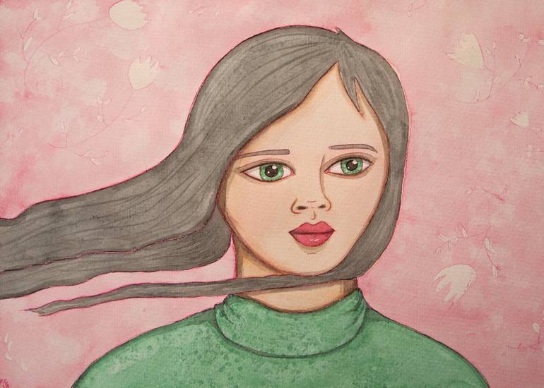 Original watercolour portrait painting in pink and green with floral decoration, on watercolour paper.