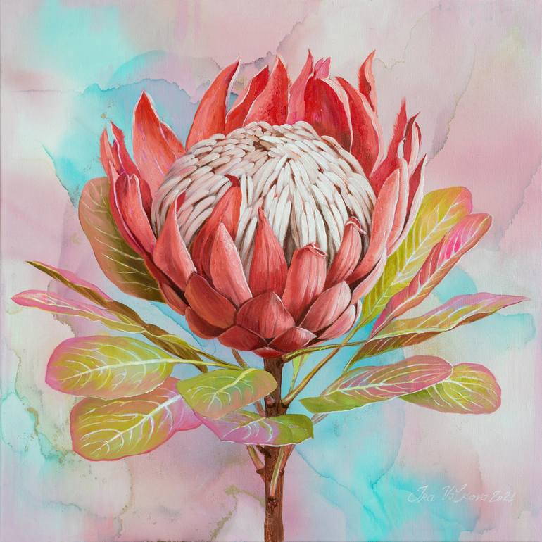 Pink protea flower on a delicate watercolor background. To make this painting light and weightless, I used a mixed technique: alcohol ink, watercolor, acrylic and oil paints on canvas. The flower is drawn in great detail, you can feel the rough proteus petals. The picture can be hung without...