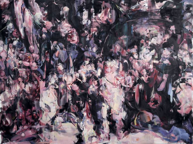 Pink Protectors, oil on Italian canvas, 194x259cm, 2018 deconstruction of the Night Watch by Rembrandt