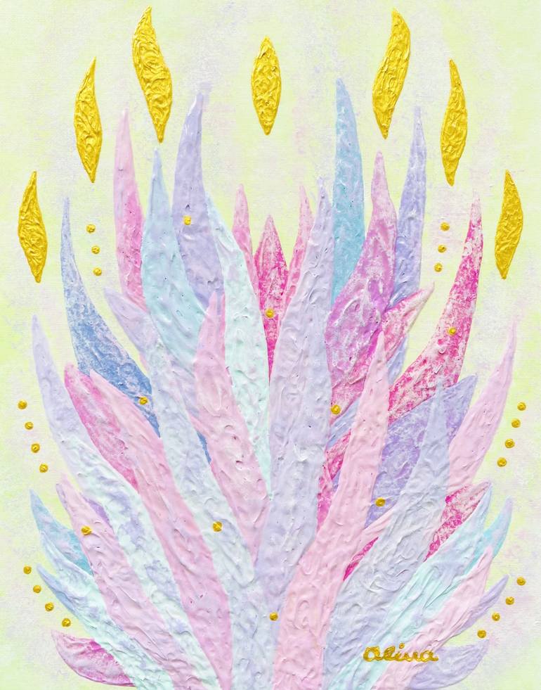 Painting imagines a flame with pink and puple hues. The painting uses textured colors with gold sparkles. The work was painted with acrylic on stretched canvas board, it is signed in the lower right corner, and it is sealed with acrylic varnish to protect from fading and moisture (requires framing).