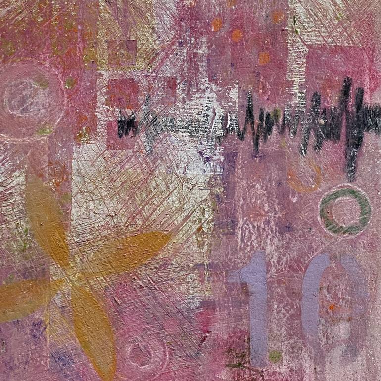 This artwork was created with cold wax medium, oil paint and pastel on gessoed paper. The pieces are 9 x 9 inches, framed with shadow-box mat with anti-reflective glass. Each features a number from 7 to 10. Fanciful pinwheels, dot patterns and circles predominate this series. Colors include hot pink...