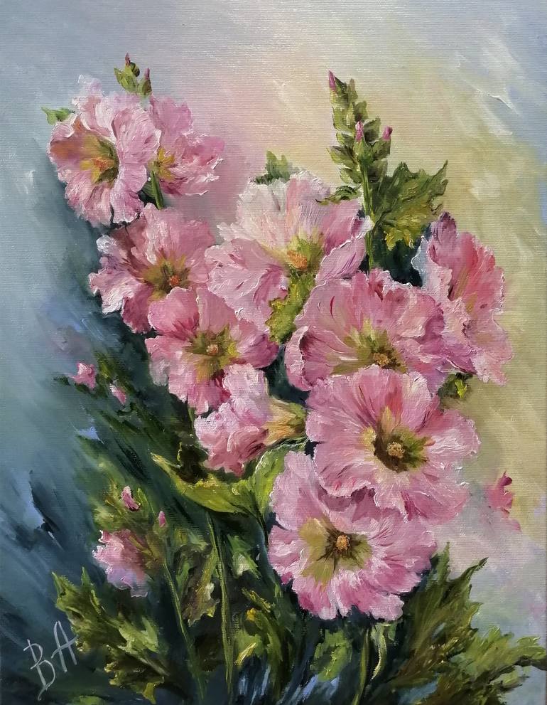 Single copy art with pink mallows. Stretched canvas, gallery stretch, oil. The painting contains the author’s signature. The ends are painted, the image continues at the ends.