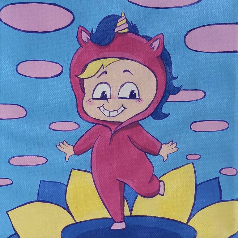 Unicorn dancing at a party to unicorn's tracks —— —— All sidles of the canvas are painted as a continuation of the painting so it is ready to be hung. Original work. The work has the signature of the author on the reverse side. Photo colors may differ slightly from the original.