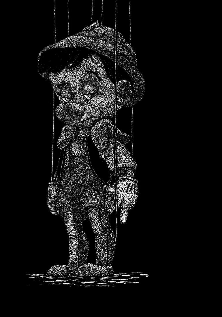 Sometimes even a puppet needs to find it's sly way to fuck-off the system. Technique: scratchboard It was a very slow and meticulous job because every single mark was made with a pin with which I engraved the black paint on a transparent plastic sheet. The artwork will be shipped with its own pass...