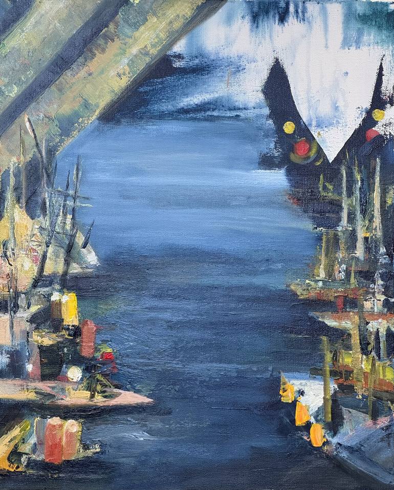 Jonathan Rogers is an artist who lives and works in London. His work is inspired by landscapes, both natural and urban, particularly from those areas of London where those environments come into contact, such as its canals and riversides. His paintings evolve from initial realistic depictions into more abstracted images while retaining some of the original figurative elements. This reconfiguration process may involve repeated re-workings over the original image or the development of a series of paintings, in either case the origins may be hidden but not completely erased. Jonathan uses heightened or non-naturalistic colour in many of his works, as means of expression, free from the need to portray objects in their natural colours. He paints predominantly in acrylic on canvas, found pieces of wooden board, or recycled old canvases leaving traces of the earlier painting.