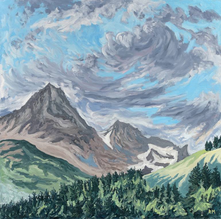 I painted this work in studio after an oil sketch made on site in the Swiss Alps of the Piz Julier and Piz Albana near St. Moritz, Switzerland.