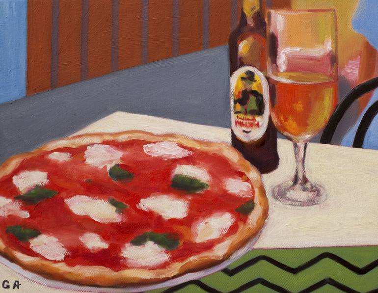 Still life oil painting inspired by lunch in Venice with delicious pizza Margherita and Moretti beer. The painting is ready to hang with hardware attached in the back.