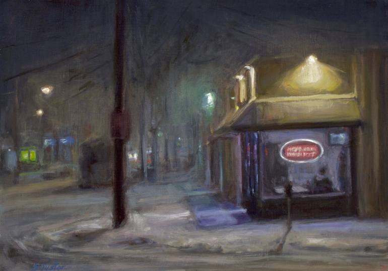 A heavy snowstorm begins and the streets are quiet. The neighborhood pizzeria stays open till the last possible minute.