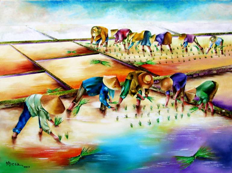This painting captures the traditional Filipino occupation of farm life in a community of men and women on a hot sunny day. No dark colors are used to produce a feeling of tranquility and peace. Instead I used yellows, orange, purples to reflect the true Filipino soul of endurance and hard work. It...