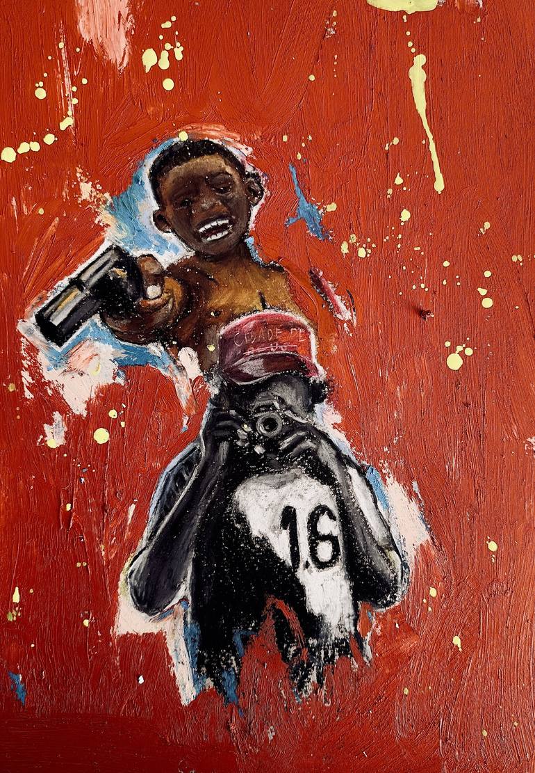 Two figures are entangled—one holds a gun, the other a camera. Both are "shooting," but from vastly different perspectives: one captures truth, the other enforces it. The composition blurs the line between witness and perpetrator, questioning who controls the narrative. The title hints at the fragil...