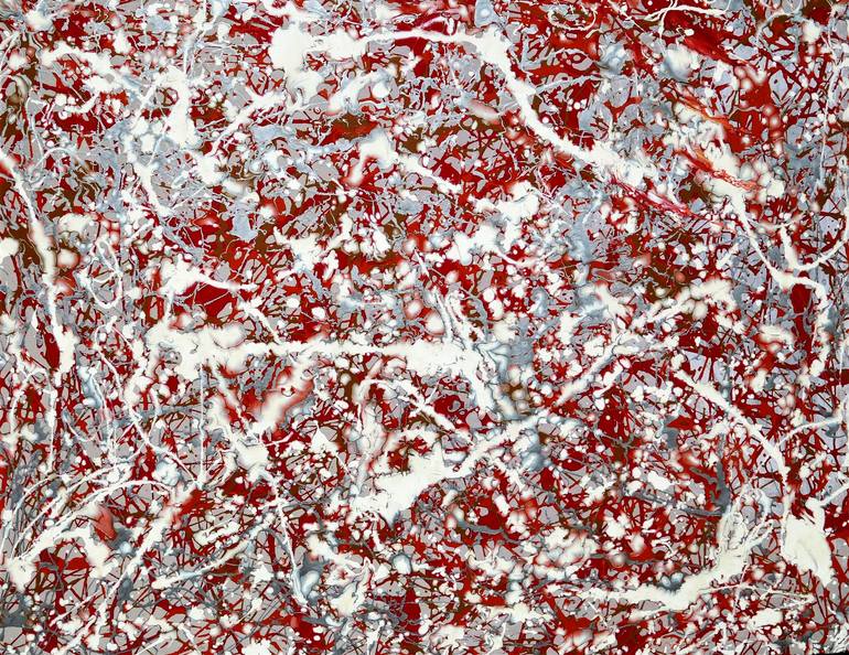 This free-flowing composition combines aluminum, gold, red & white enamels allowed to combine to create a halo of colors & shapes inspired by nature. Look closely to see the intricate design & spatial depth. Note: Canvas is professionally stretched with hardware - ready to frame.househol...