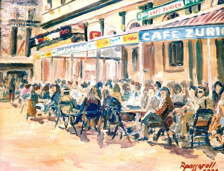 El antiguo "Café Zurich", situado en la Plaza Catalunya de Barcelona con su terraza llena de gente y el ir y venir de los camareros.
