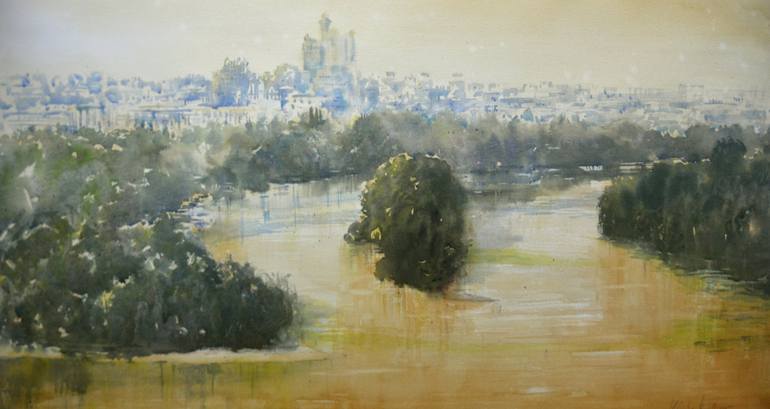 This original watercolor painting by Nenad Kojić, titled "Pogled na ušće - zeleno i zlatno Beograd," captures a unique landscape. The artwork presents a view of Belgrade where the Sava and Danube rivers converge. The artist's technique showcases fluid washes of watercolor on paper, with a rich inte...