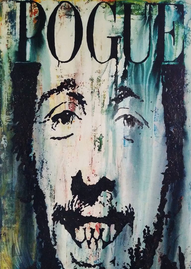 humour piece , Shane Macgowan front cover of Vogue magazine, self explanation. recreate weathered and old street art .