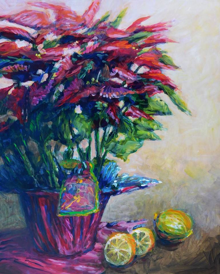 Seasonal poinsettia with lemons rendered in an expressionistic manner. Copyright (c)