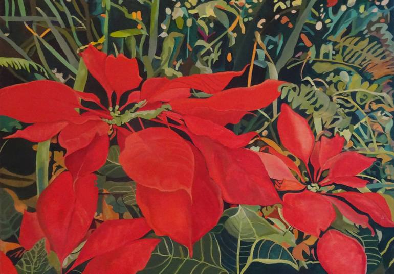 A winter-flowering poinsettia seen from above against a background of ferns and irises