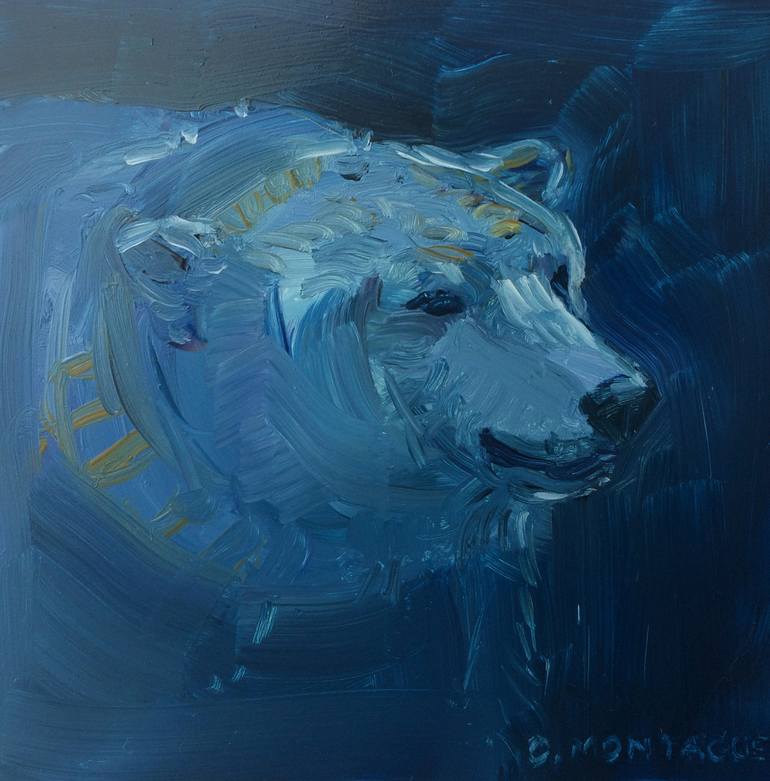 Christine Montague is an award-winning realism painter who creates beautiful, haunting and inspiring paintings about the iconic polar bear and its vulnerability to climate change. For the past decade she has used her skills (BFA, BSc.) to create realistic portraits of this highly intelligent, powerful apex predator against backgrounds symbolic to the threat it is under. Colour, canvas and various aesthetics symbolize wonder, hope and warning. Christine's polar bear paintings are in collections worldwide. Christine accepts custom and portraiture painting commissions, She is based in Burlington, Ontario, Canada. More about Christine Montague - When polar bears were listed on the Species At Risk Act, Montague began her passionate journey of painting polar bears. She uses her portraiture and realism oil painting skills, to document and celebrate the polar bear's character and spirit, its high intelligence (think great ape), and its survival in a world of vanishing sea ice. Through her travels to the Canadian arctic (Iqaluit & Cape Dorset, Nunavut) and subarctic (Churchill,Manitoba, Canada - polar bear capital of the world), Montague has furthered her knowledge on polar bears and climate change. In September 2017, "Dark Water 1", a painting of a polar bear in an unfrozen sea, took top award at the Canada wide Canadian National Exhibition Juried Show. “Dark Water”, Montague’s solo show of polar bears and climate change was exhibited at Toronto's Artworld Fine Art Gallery March - April 2018. (now Donna Child Galley) "on thin ice" is the name of Montague's solo show (Jan. 2 - March 1, 2020) at the Montgomery's Inn Museum, in Toronto, Ontario. In 2023, her 3rd polar bear solo show "Polar Bear Wonder and Warning" took place at the Fireside Gallery at Art Gallery of Burlington, Burlington, ON. Montague’s painting’s have been in over 80 art shows, and are award winning. Her work can be found in collections in Canada, U.S.A., the Netherlands, Denmark, Great Britain, New Zealand, and Australia.