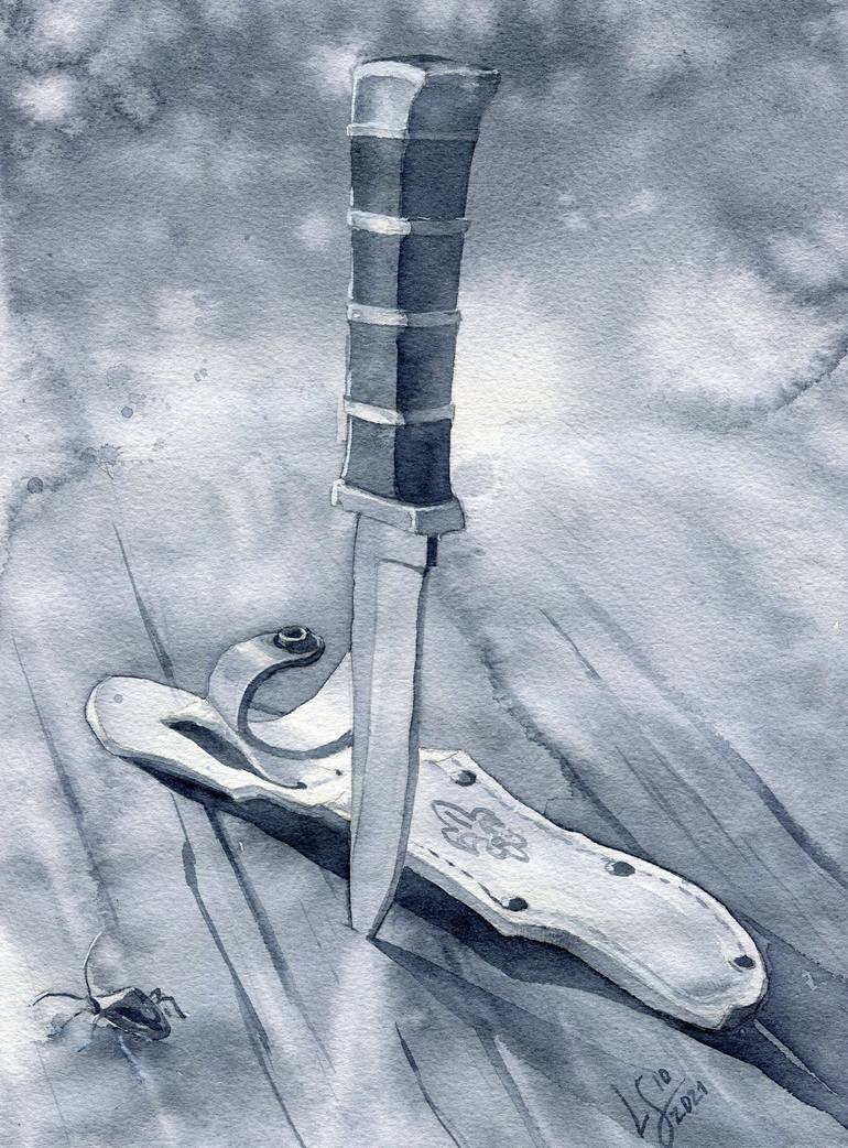 This piece is executed in the watercolor grisaille technique, using Payne’s Gray to evoke a deep atmosphere of mystery and solitude. The central subject is a Polish scout knife, embedded in a wooden surface. The simplicity of the scene highlights the sharpness of the blade and its significance as an...