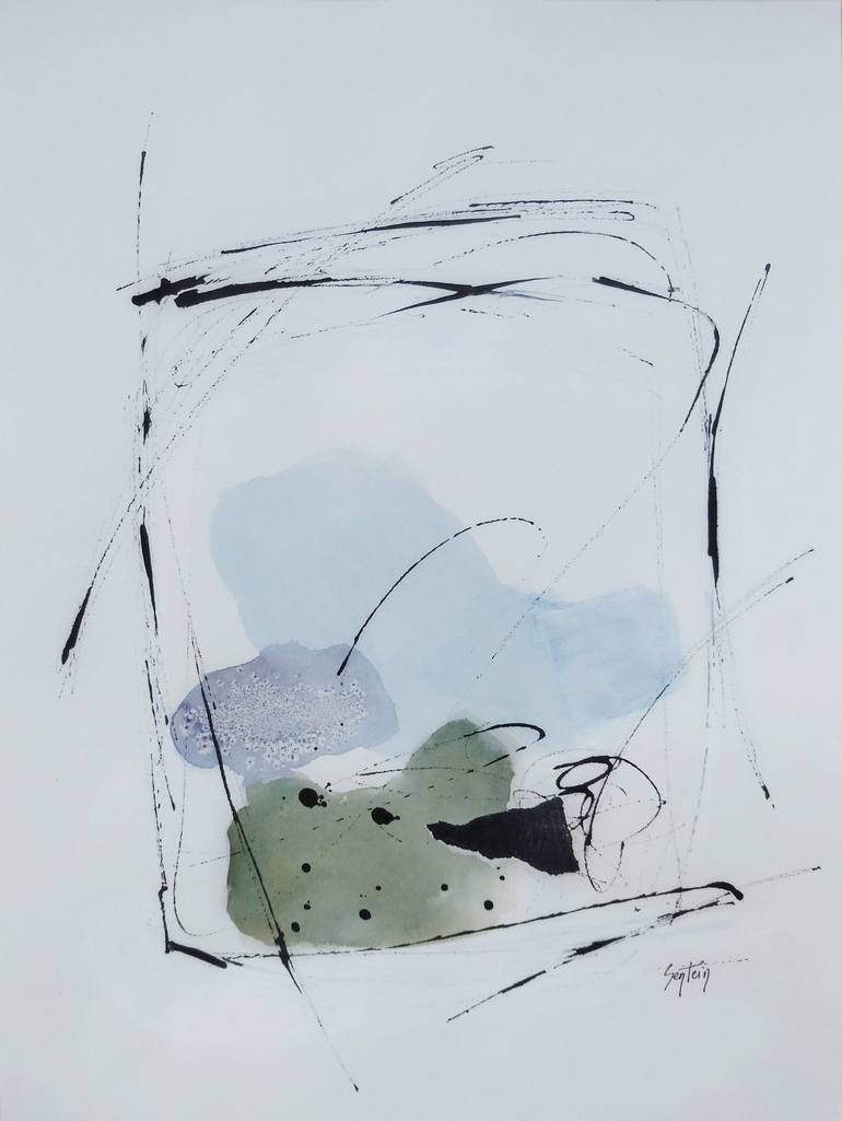 Cette série intitulée Polygraphisme, néologisme que j’ai emprunté aux écrivains, est un travail sur l’abstraction graphique où coexistent et interfèrent formes, traits, traces, graffitis, matières et couleurs. Ici le petit collage noir équilibre les formes gris vert et gris violine réalisées à l’en...