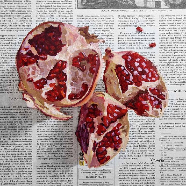 Pomegranate oil painting on newspaper, fruit art. Picture with red pomegranate half, wall art for your kitchen, small gift or souvenir. -Title: Pomegranate -Picture size: 30x30 cm / 11,8x11,8" -Materials: oil, newspaper, HDF board, UV protection. -Year of creation: 2022 -The picture is UNPAINTED -S...