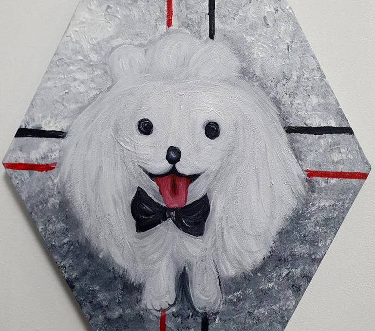 Pomeranian dog very popular dog in Europe example Poland and Germany, these beauties had many royal owners in the past, my idea with this beauty contrasting it with red and white represent the colour of England flag, seems to at the charming everyone pointy tongue in this black bow tie.