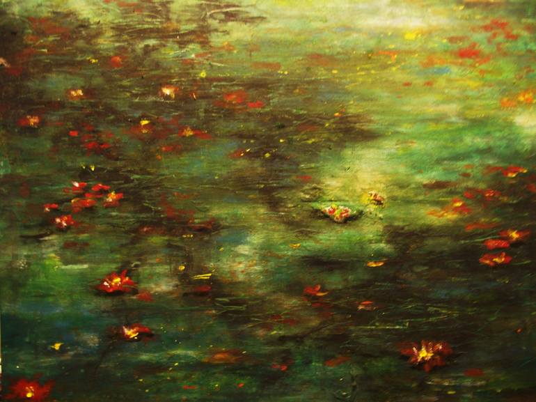 A pond of still water, flowers and leaves gently move changing the scene, just like a dream. A landscape of possibilities and reflections at days gone.