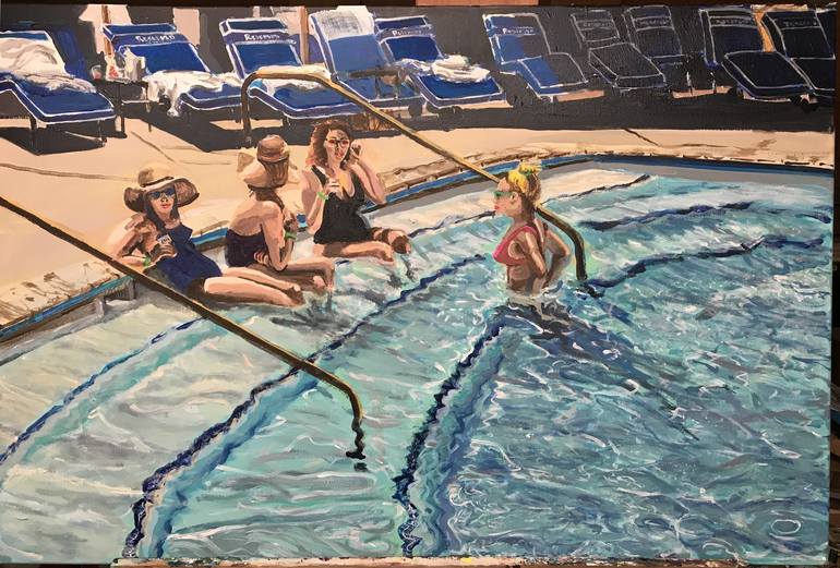 On a visit to the Coppola Winery in Independence, Sonoma, CA., I sat by the lovely pool they have there and enjoyed a cool drink as I watch the pool-goers enjoying the sun and water and general ambiance. I wanted to paint this happy yet stylish scene. In the painting I hoped to achieve a dynamic bal...